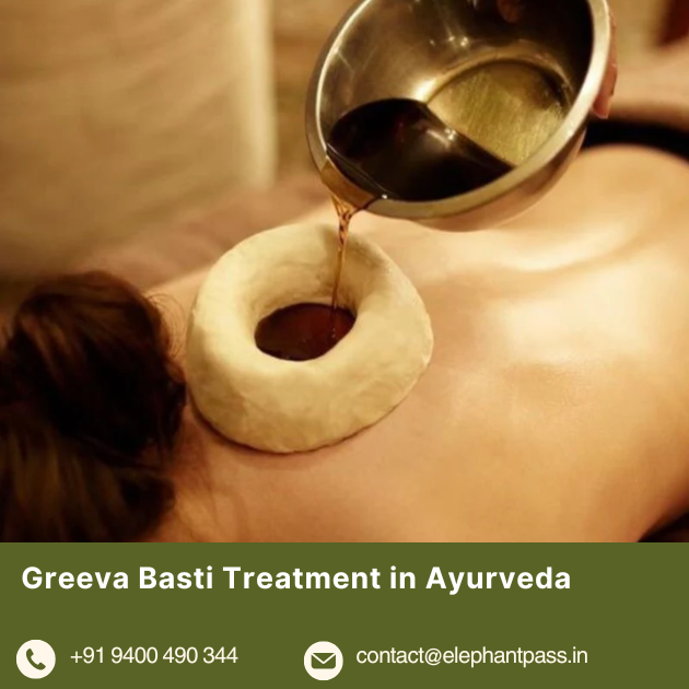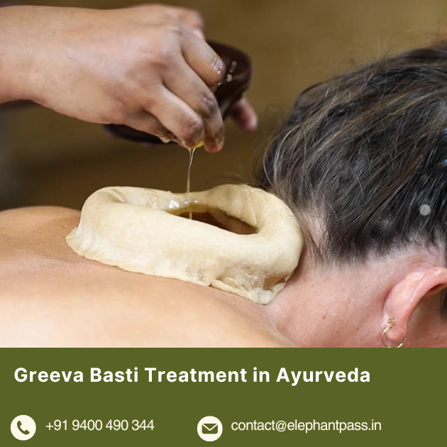 At Elephant Pass Ayurveda & Yoga Retreat near Kochi, Greeva Basti functions as a doctor-prescribed essential therapy for cervical spondylosis, tech neck, and headache management within arthritis, Panchakarma, and spine health programs.